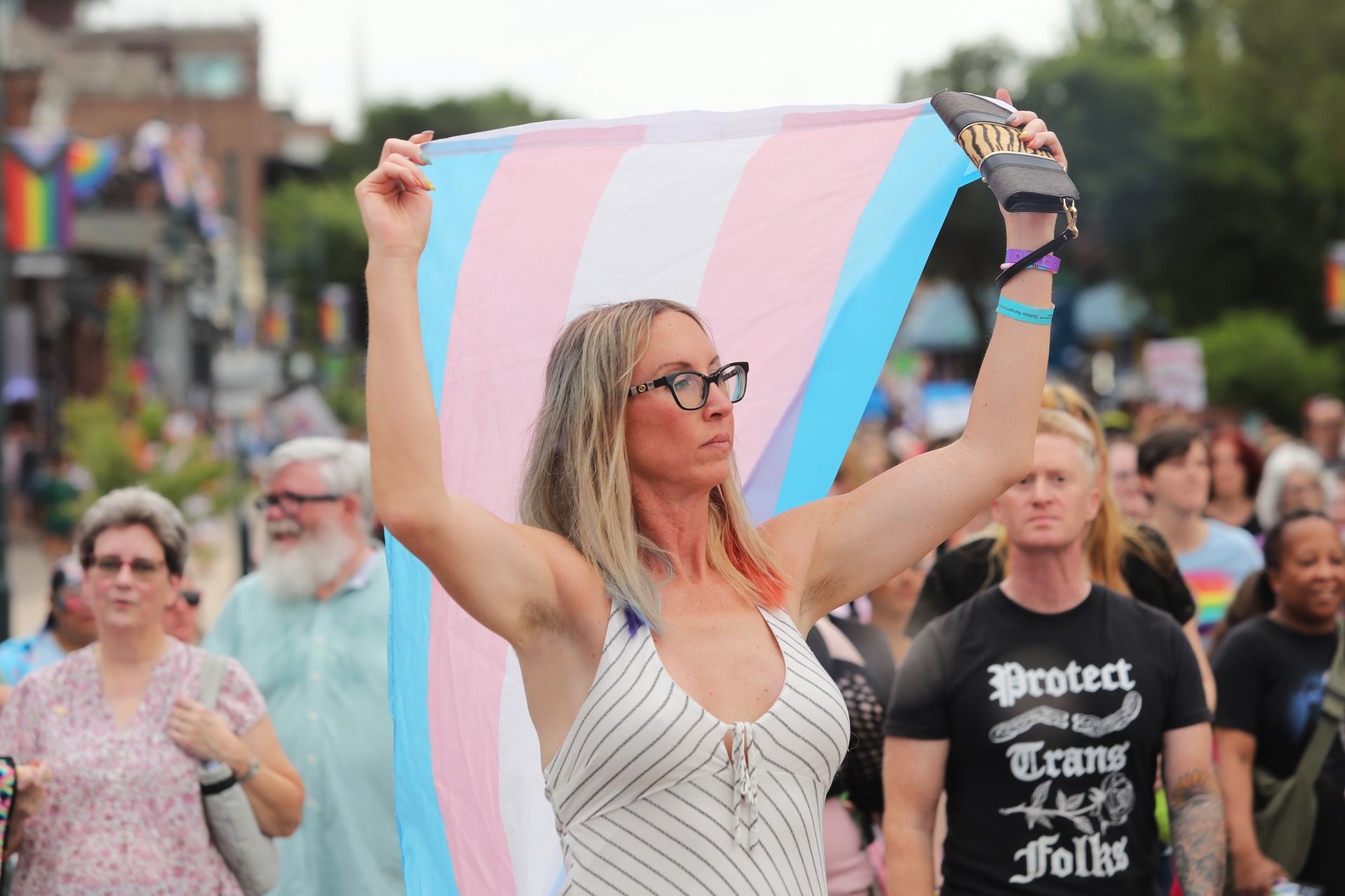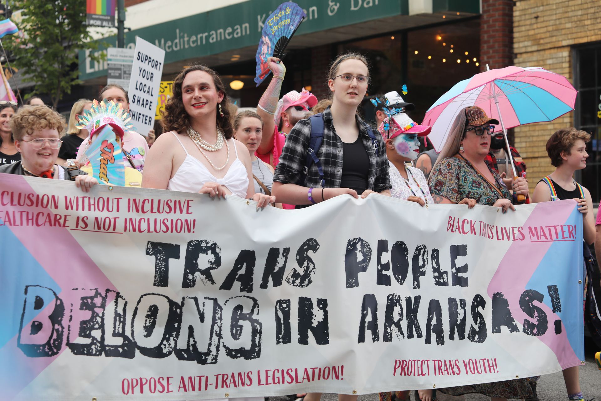 A group walks down Dickson Street in downtown Fayetteville last June during NWA Equality’s 2025 Trans March.